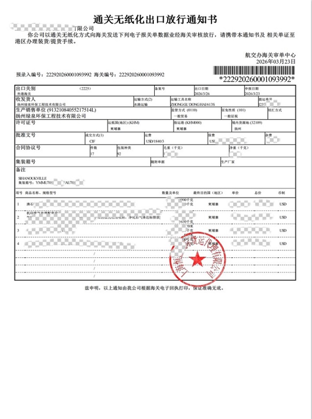 Iniulat, ang timeline para sa paghahatid na ito ay parehong mahigpit at napakahusay. Noong ika-22, matagumpay na nakuha ang kagamitan at agad na ikinarga sa isang sisidlan noong araw ding iyon. Kasunod nito, matagumpay na tumulak ang carrier noong ika-26, dinadala ang kagamitan sa Cambodia sa pamamagitan ng daluyan ng tubig. Ang paghahatid na ito ay hindi lamang nagpapakita ng lubos na mahusay na mga kakayahan sa pagpapatupad ng Lvquan Environmental sa cross-border logistics management ngunit ipinapakita rin ang nangungunang teknolohikal na posisyon nito sa larangan ng industrial waste gas treatment para sa industriya ng pag-print.