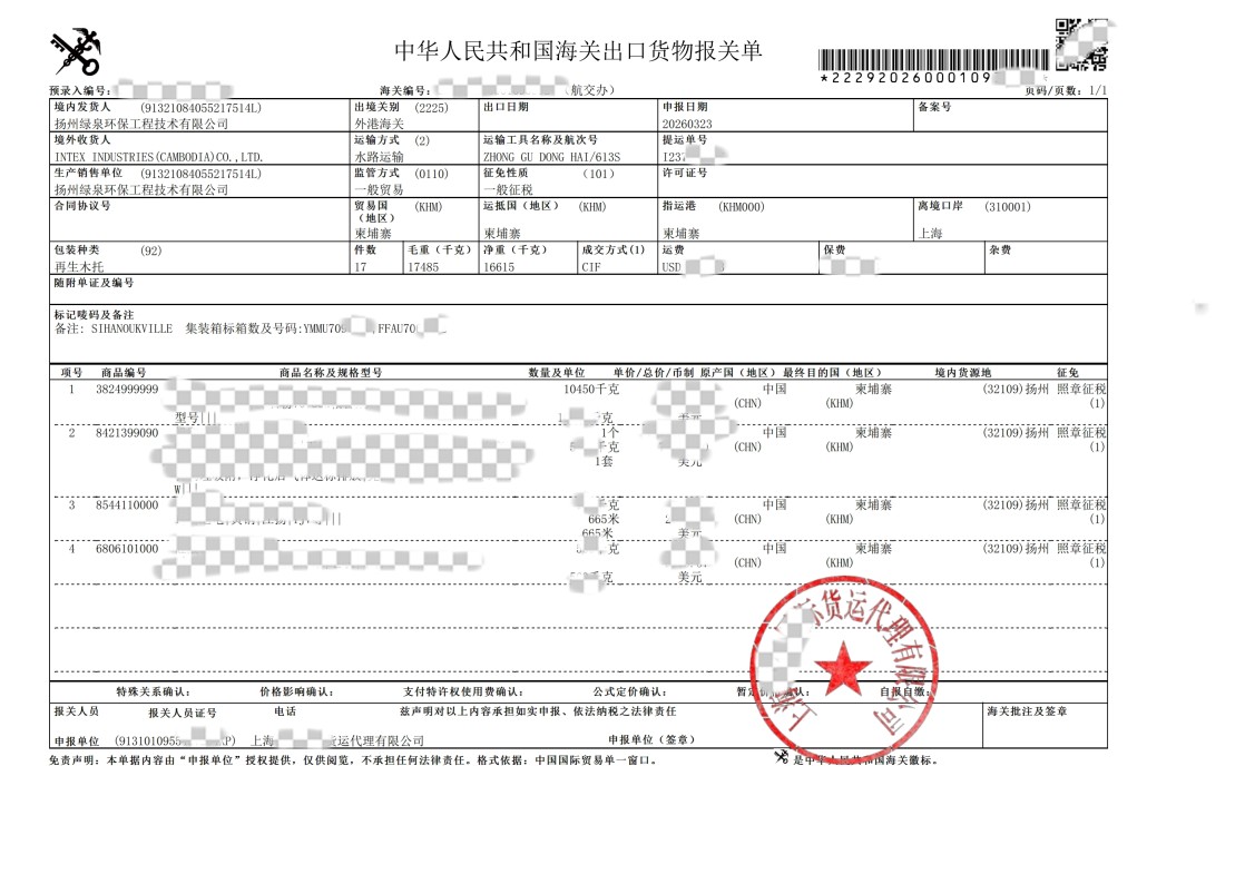Tingnan ang mga detalye[Phnom Penh, Cambodia, Marso 22, 2026] — Matagumpay na nakumpleto kamakailan ng Lvquan Environmental Protection Engineering Technology Co., Ltd. ang isang makabuluhang cross-border na paghahatid, na nagbibigay ng isang set ng advanced na Printing Exhaust Gas Treatment Equipment sa Cambodian na kliyente nito, INTEX INDUSTRIES (CAMBODIA) CO., LTD.