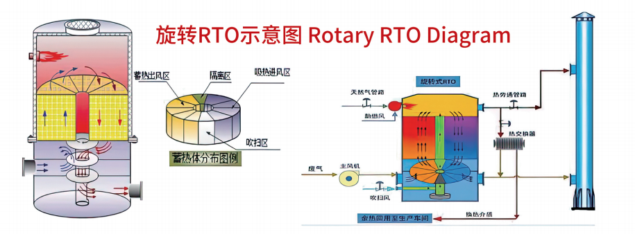 Ang rotary RT0 higit sa lahat ay binubuo ng isang silid ng pagkasunog, ceramic packing bed, at rotary valves, atbp. Ang basurang gas ay pumapasok sa preheating zone sa pamamagitan ng distributor ng paggamit, at pagkatapos na ma -preheated sa isang tiyak na temperatura, pumapasok ito sa tuktok na silid ng pagkasunog para sa kumpletong oksihenasyon at agnas. Ang purified high-temperatura gas ay umalis sa silid ng pagkasunog at pumapasok sa paglamig zone upang ilipat ang init sa materyal na imbakan ng ceramic energy, at ang gas ay pinalamig at pinalayas sa pamamagitan ng distributor ng gas. Ang materyal na pag -iimbak ng enerhiya ng ceramic sa paglamig zone ay sumisipsip ng init at nag -iimbak ng isang malaking halaga ng enerhiya para sa pagpainit ng maubos na gas sa susunod na pag -ikot. Sa ganitong paraan, ang basurang gas ay kahaliling na -oxidized at nabulok sa silid ng pagkasunog. Kapag ang konsentrasyon ng VOC sa maubos na gas ay higit sa isang tiyak na halaga at ang init na inilabas mula sa pagkabulok ng oxidative ay sapat na upang mapanatili ang temperatura ng reaksyon ng silid ng pagkasunog, hindi na kailangang gumamit ng gasolina upang mapainit ito, sa gayon pagpapabuti ng paggamit ng enerhiya cycling.